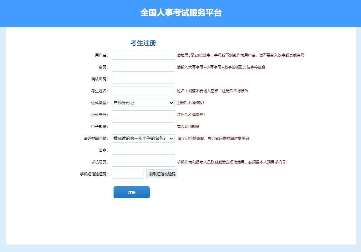 第二步:點(diǎn)擊“注冊(cè)”,進(jìn)入考生注冊(cè)頁(yè)面,考生注冊(cè)填寫個(gè)人信息