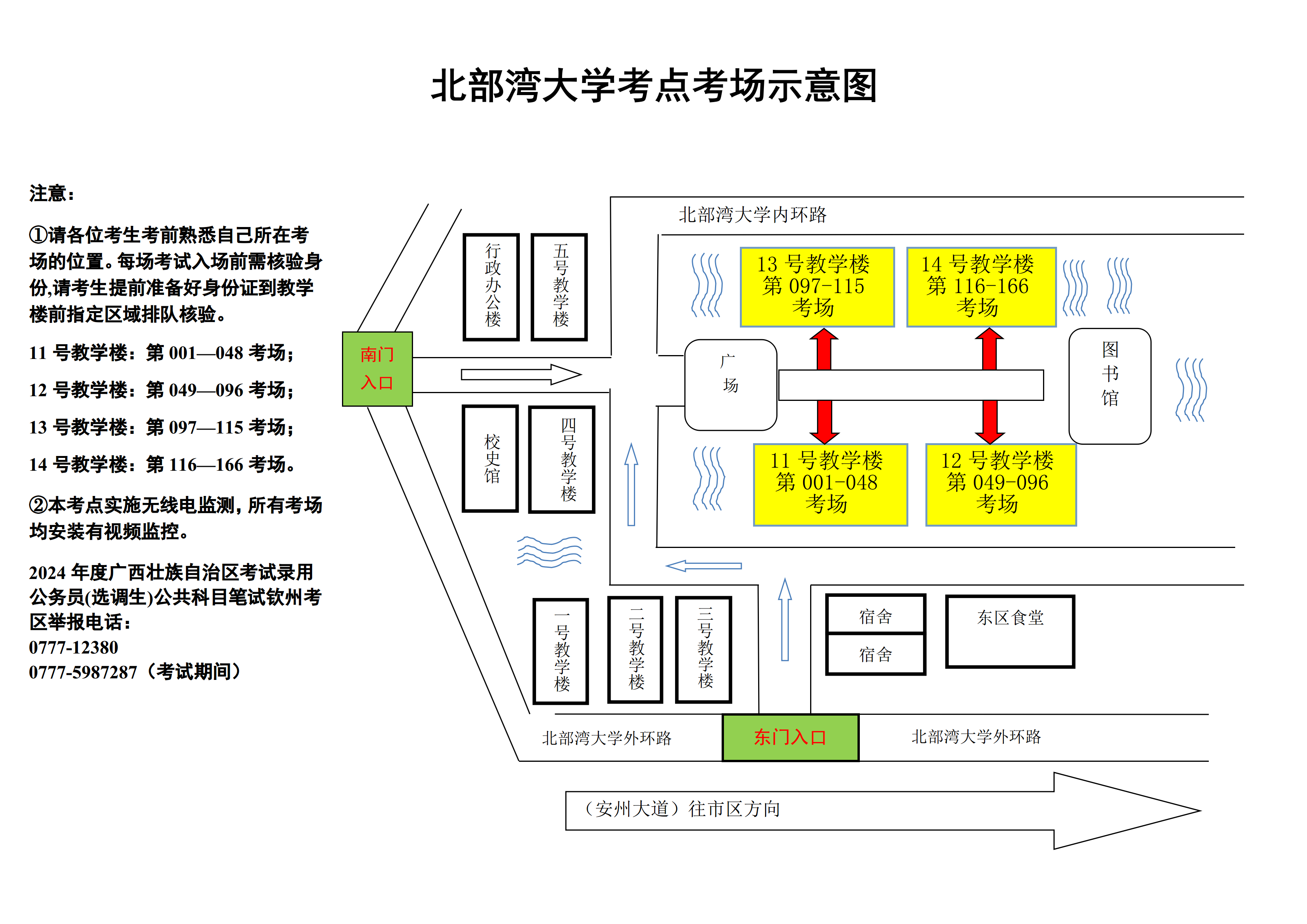 欽州考區(qū)共設(shè)兩個考點,分別為北部灣職業(yè)技術(shù)學校考點和北部灣大學考點。請核對好本人準考證上的考點,兩個考點離市區(qū)有一定距離,請關(guān)注當天天氣情況,充分考慮路途時間和天氣因素影響,每場考試前,提前60分鐘到達考點。(考點地址和具體考場安排請掃附后的二維碼查看)