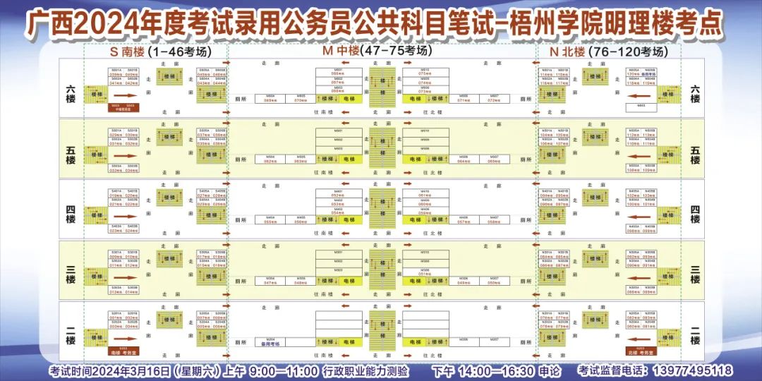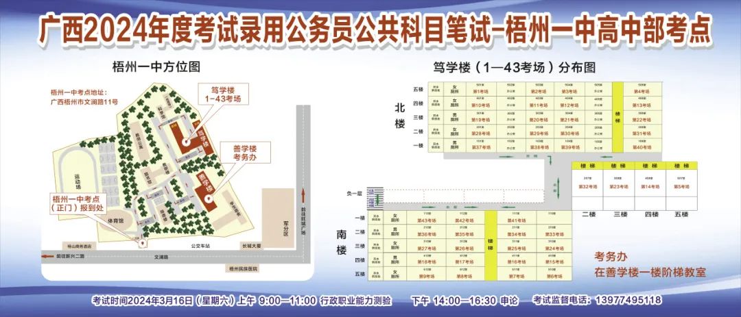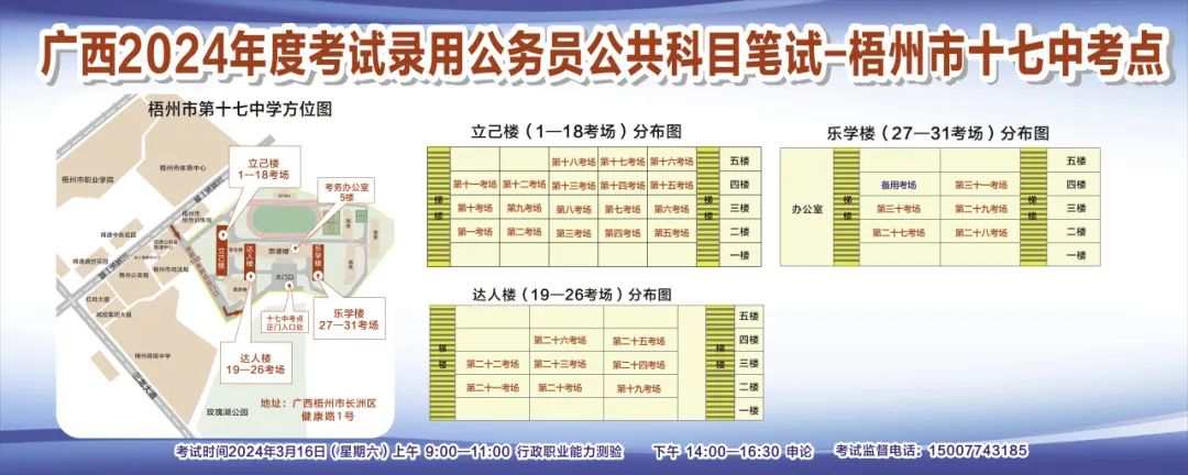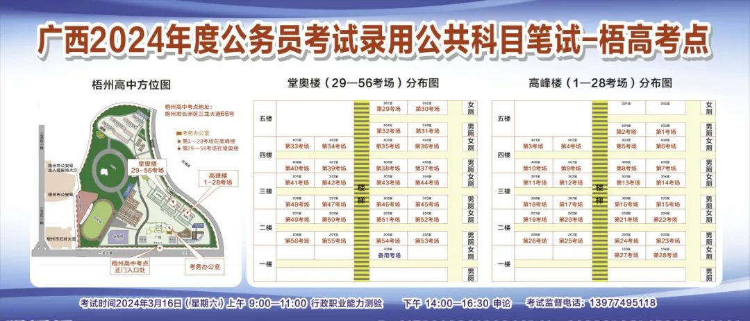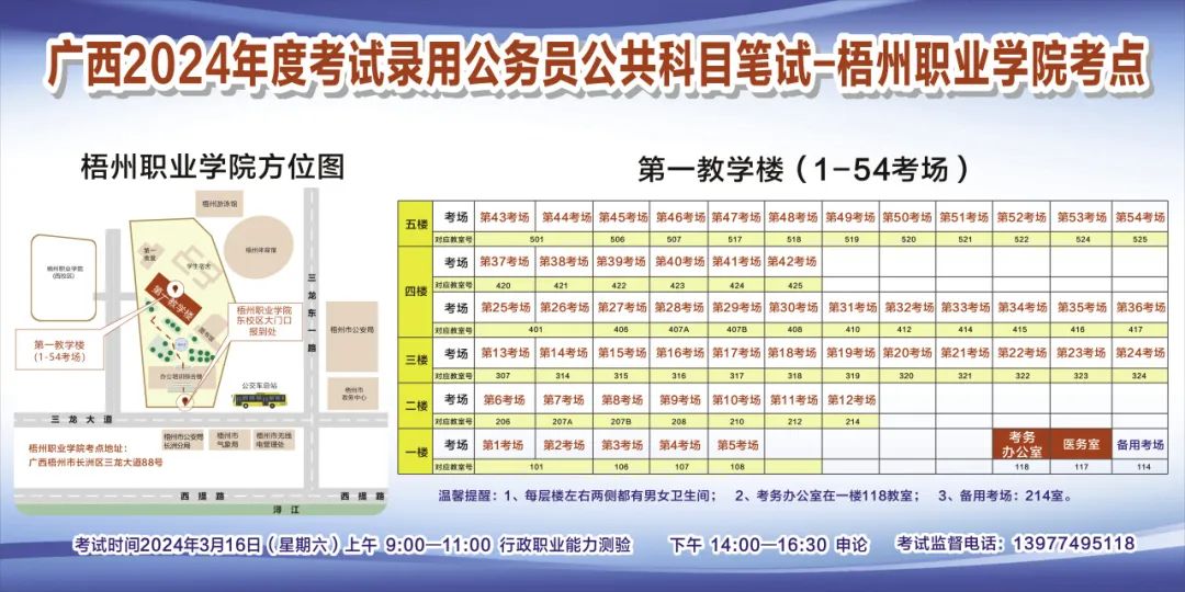 一、廣西2024年度考試錄用公務(wù)員(選調(diào)生)公共科目筆試將于3月16日舉行,梧州考區(qū)共設(shè)置9個考點,請考生提前熟悉各自考點位置、周邊環(huán)境及交通情況,考試當天提前出門做好準備,準時參加考試。特別提示:因考點停車場地有限,所有考生車輛不得進入考點,請考生規(guī)劃好前往考點的交通方式和路線。