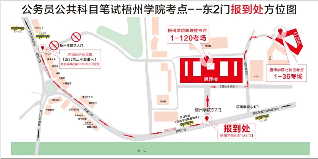 公交車參考:乘坐10路、32路、49路、49路延長線、蒼梧城鄉(xiāng)6路到梧州學(xué)院體育館站,下車后步行約200米到達梧州學(xué)院東大門??忌y(tǒng)一在梧州學(xué)院東大門進入,考點門口處于交通干道,送考車輛只能在東門外短暫停留,梧州學(xué)院南門及其他門無法核驗考生身份。從東大門進入明理教學(xué)樓考點考場步行約5分鐘,進入北校區(qū)教學(xué)樓考點考場步行約15分鐘,請規(guī)劃好進入考點時間。