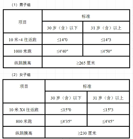 3.參照《關于印發(fā)公安機關錄用人民警察體能測評項目和標準(暫行)的通知》(人社部發(fā)〔2011〕48號)的項目及測試規(guī)則,結(jié)合《公安民警體育鍛煉達標手冊》成績標準,體能測評的項目和標準如下: