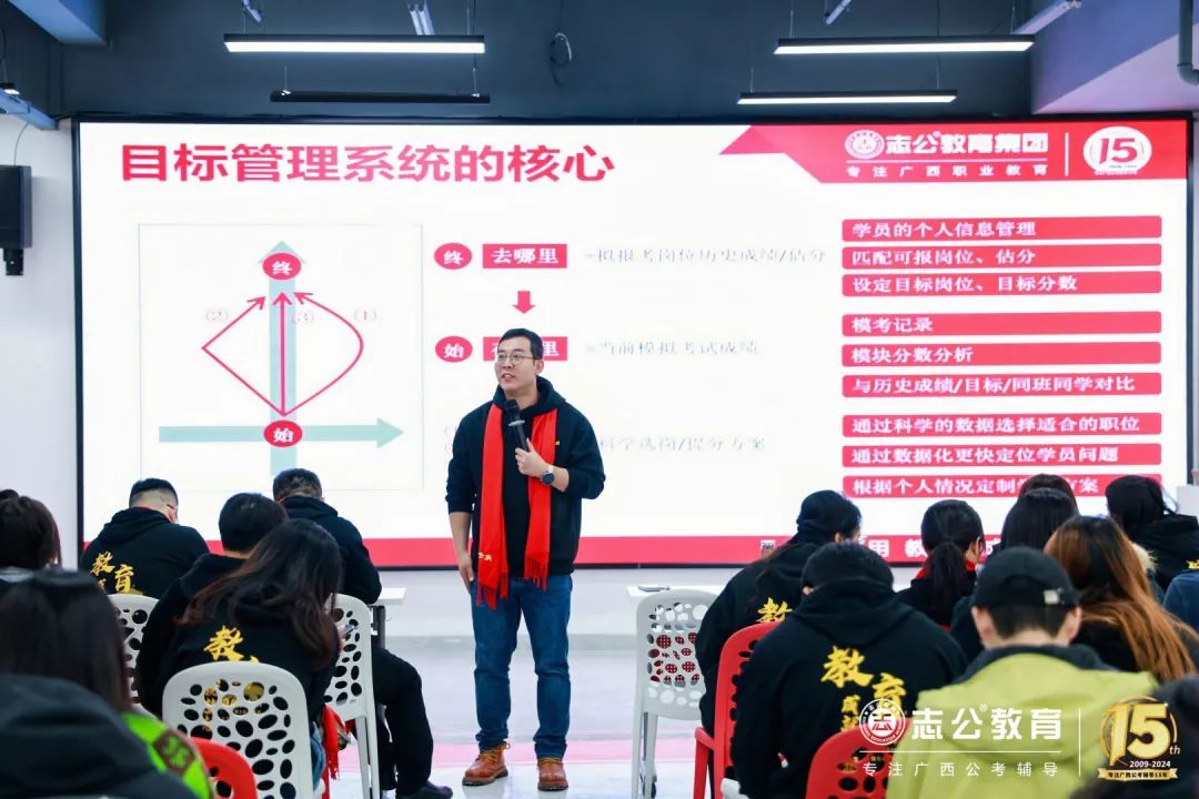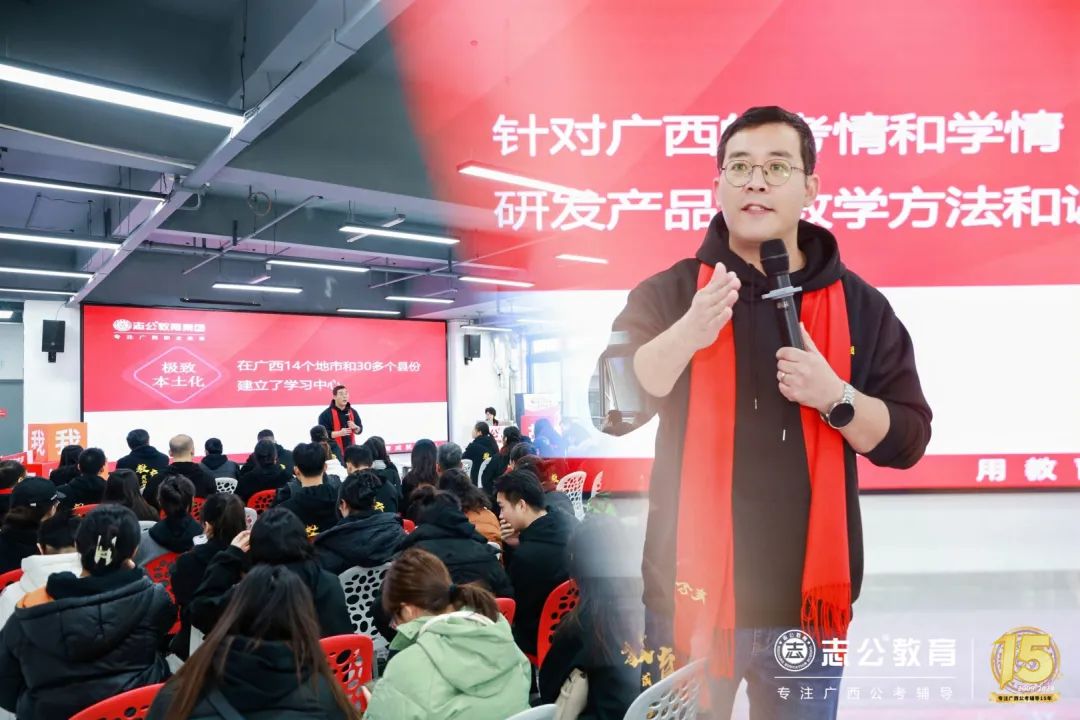 第一是極致本土化,董事長李勇表示這是志公教育集團(tuán)安身立業(yè)的根本,他表示這要求對(duì)廣西公職考試響應(yīng)速度要快,針對(duì)廣西的考情和學(xué)情,研發(fā)產(chǎn)品教學(xué)方法和課程資料,這是對(duì)教研院的考驗(yàn),明確表示未來要把錢投在學(xué)員的服務(wù)上、老師的數(shù)量、學(xué)習(xí)班主任。志公教育現(xiàn)在有志公教育(保稅區(qū))全封閉基地,志公教育(中關(guān)村)全封閉基地,未來希望在桂林,柳州,百色等地也建立基地,讓志公教育在八桂大地生根,實(shí)現(xiàn)各美其美,美美與共。