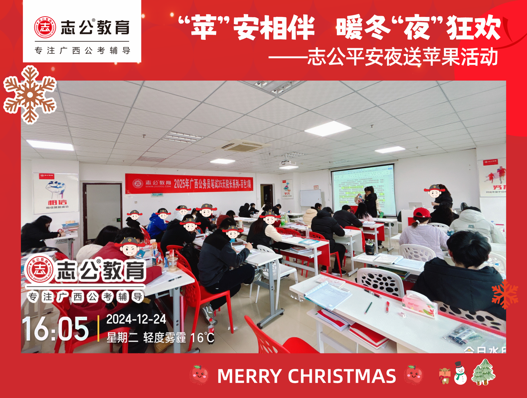 在基地的日日夜夜,學(xué)員們都在奮筆疾書,抓緊時(shí)間備考,從200天、到170天、150天、130天、100天等各類班級的學(xué)員。大家似乎已經(jīng)愛上了這樣的備考“大家庭”,讓這個(gè)冬日更加的溫暖了。志公教育基地班班主任和學(xué)員們,亦師亦友。一起歡樂度過快樂平安夜~~