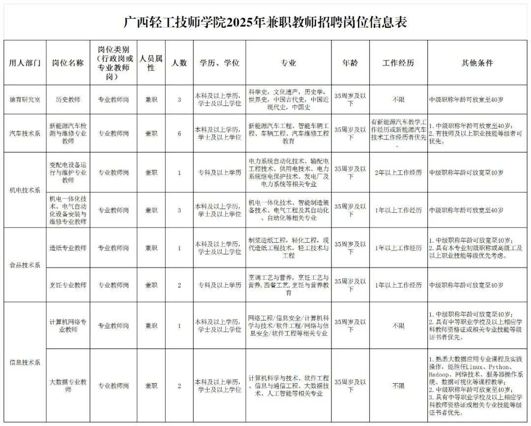 歷史教師,新能源汽車檢測(cè)與維修專業(yè)教師,變配電設(shè)備運(yùn)行與維護(hù)專業(yè)教師,機(jī)電一體化技術(shù)、電氣自動(dòng)化設(shè)備安裝與維修專業(yè)教師,造紙專業(yè)教師,烹飪專業(yè)教師,計(jì)算機(jī)網(wǎng)絡(luò)專業(yè)教師,大數(shù)據(jù)專業(yè)教師。