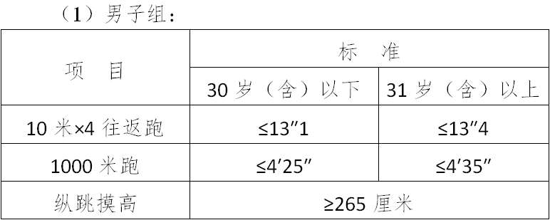 體能測試項目評分標準根據(jù)人力資源和社會保障部、公安部、國家公務(wù)員局《關(guān)于印發(fā)公安機關(guān)錄用人民警察體能測評項目和標準(暫行)的通知》(人社部發(fā)〔2011〕48號)等規(guī)定,體能測評的項目和標準如下: