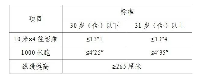 參加者凡有其中一項不達標(biāo)或放棄,視為體能測評不合格。體能測評合格,方可進入下一環(huán)節(jié)。體能測評項目中,縱跳摸高的測評次數(shù)不超過3次,往返跑的測評次數(shù)不超過2次,長跑測評次數(shù)僅為1次。