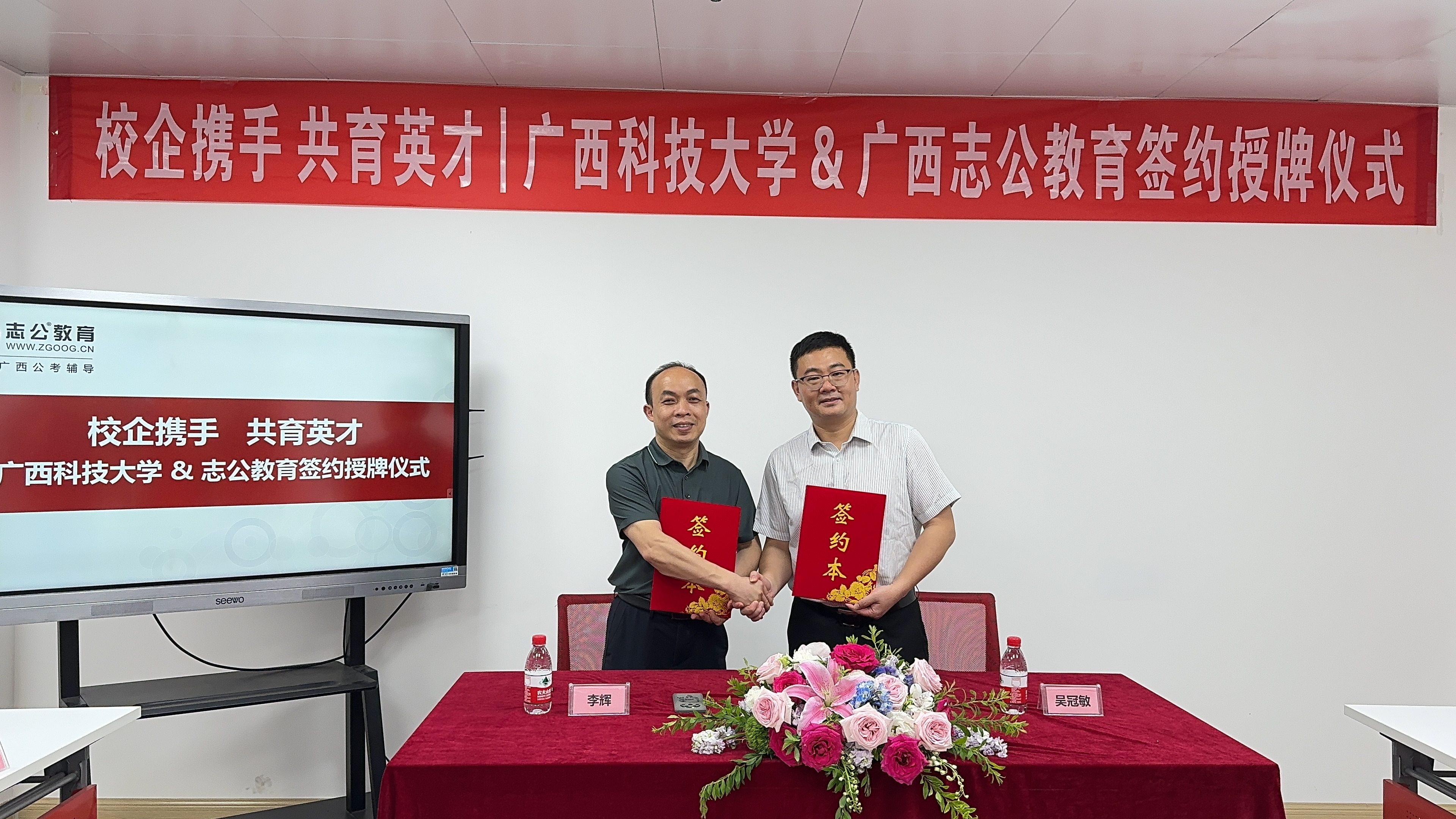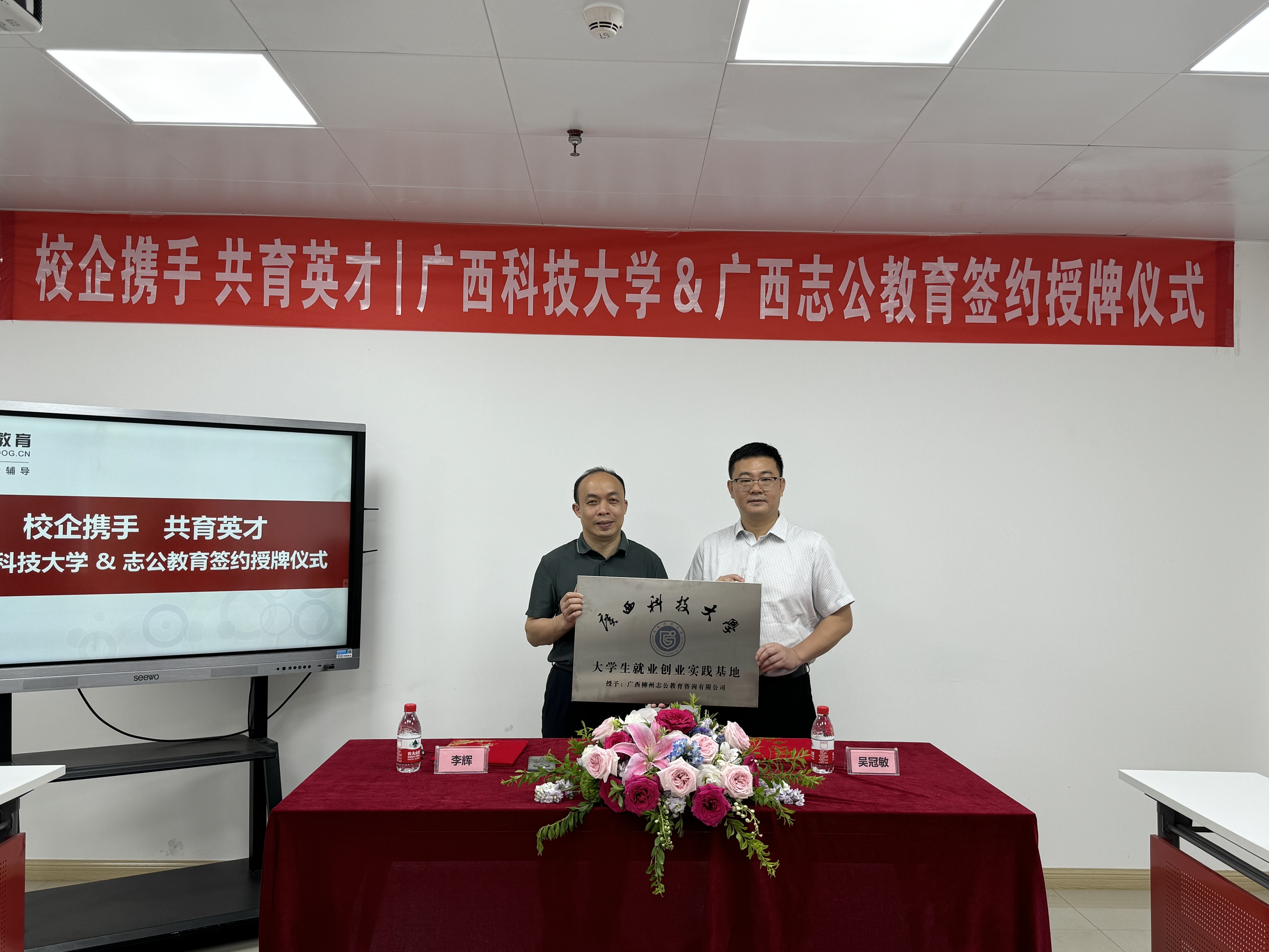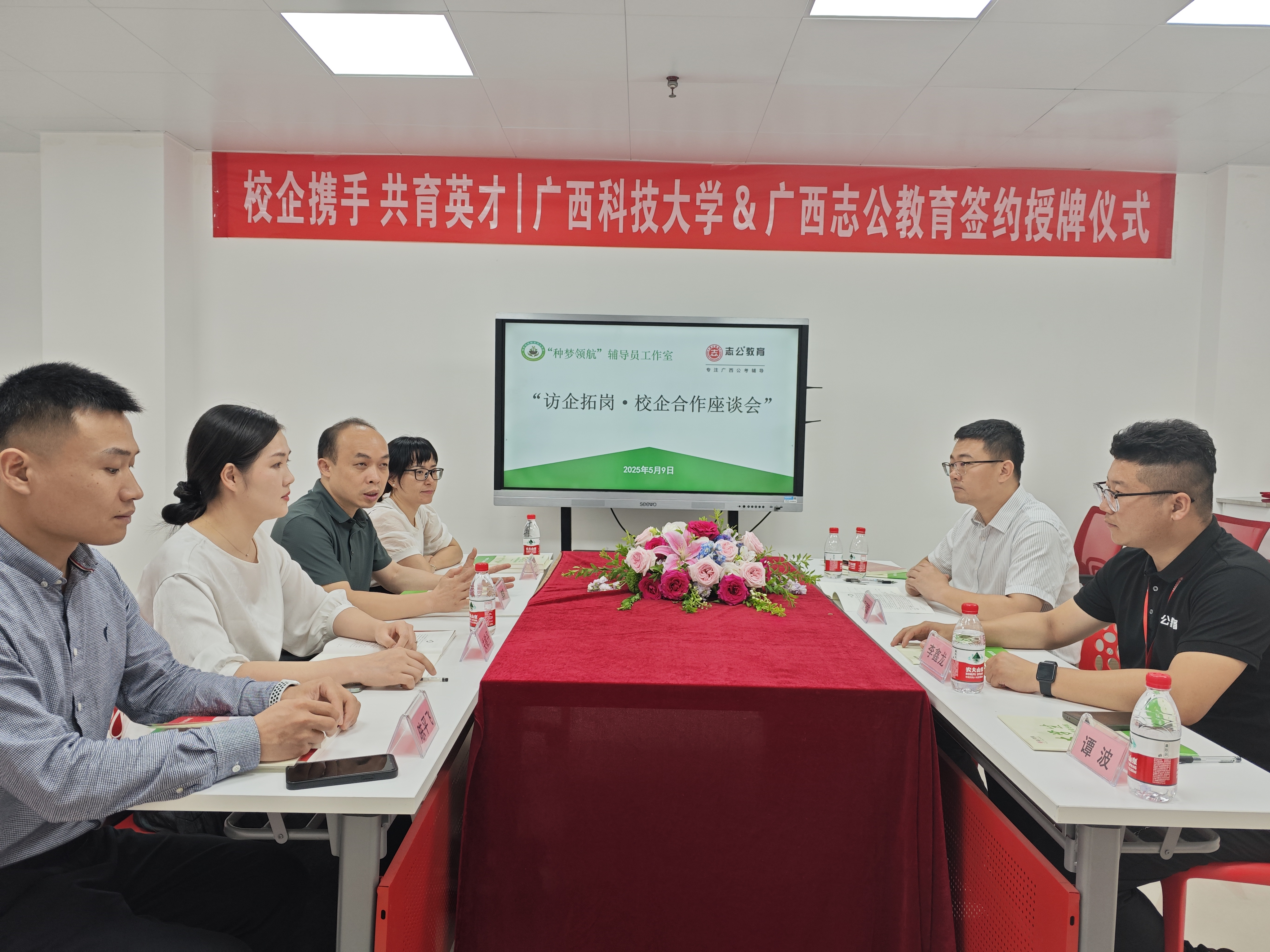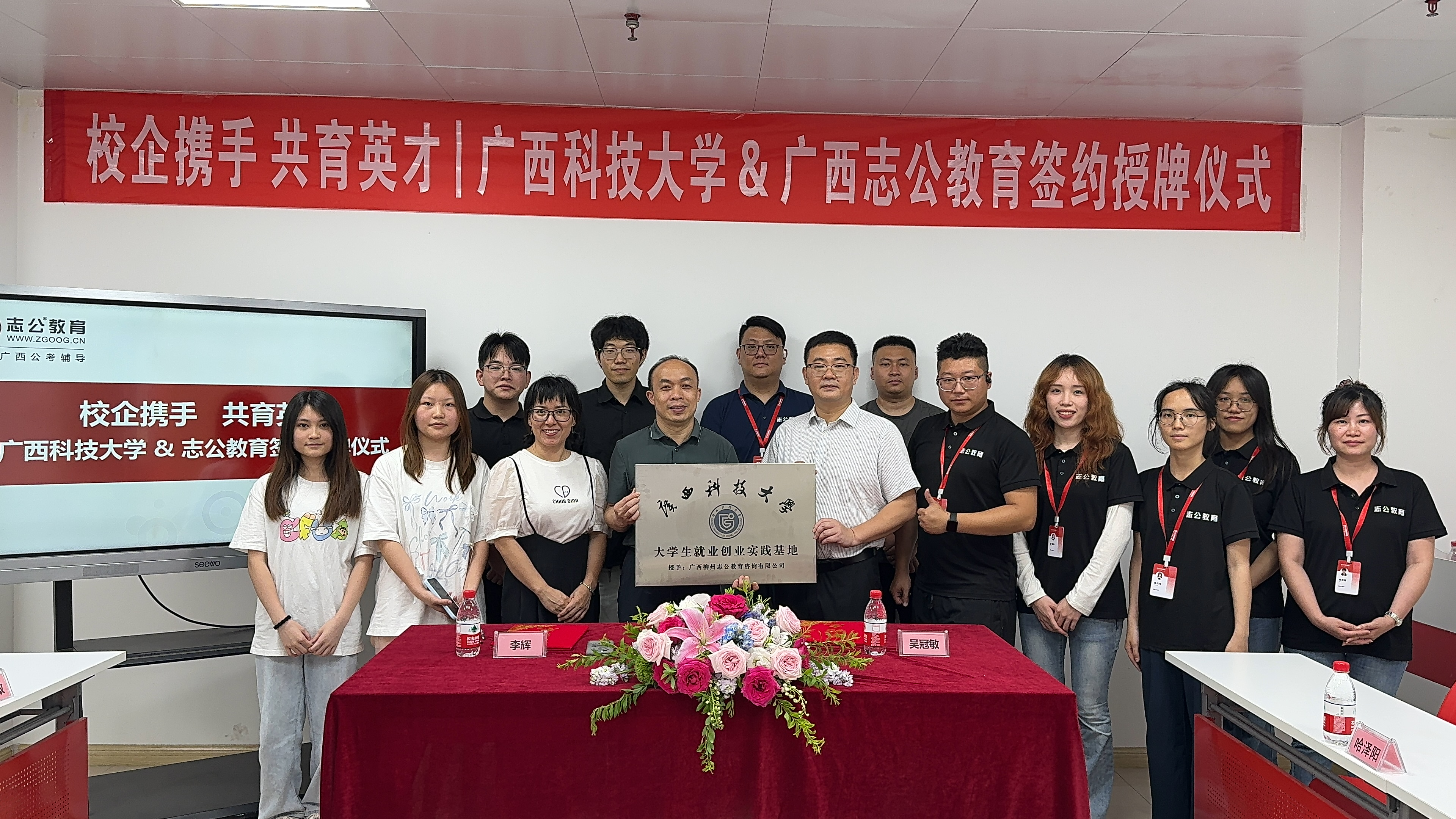 2025年5月9日,志公教育柳州分校與廣西科技大學(xué)外國語學(xué)院在深入交流與友好協(xié)商的基礎(chǔ)上,于廣西科技大學(xué)成功舉行戰(zhàn)略合作簽約儀式。此次活動由志公教育CBG總經(jīng)理吳冠敏先生帶隊,廣西科技大學(xué)外國語學(xué)院黨委書記李輝、廣西科技大學(xué)"種夢領(lǐng)航"工作室負(fù)責(zé)人張林微及師生代表共同參與,標(biāo)志著雙方在產(chǎn)教融合、人才培養(yǎng)及大學(xué)生就業(yè)創(chuàng)業(yè)領(lǐng)域的合作邁入新階段。