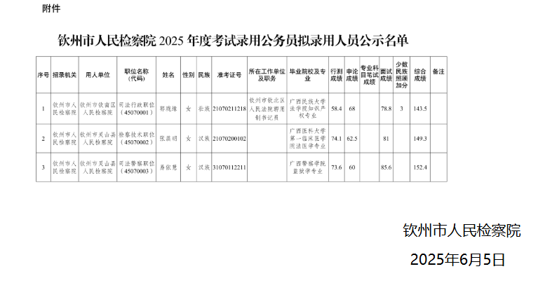附件:欽州市人民檢察院2025年度考試錄用公務(wù)員擬錄用人員公示名單