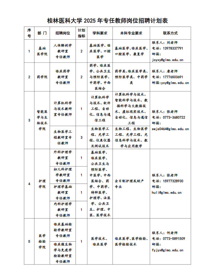 (二)各部門聯(lián)系方式見:桂林醫(yī)科大學各崗位招聘計劃表。