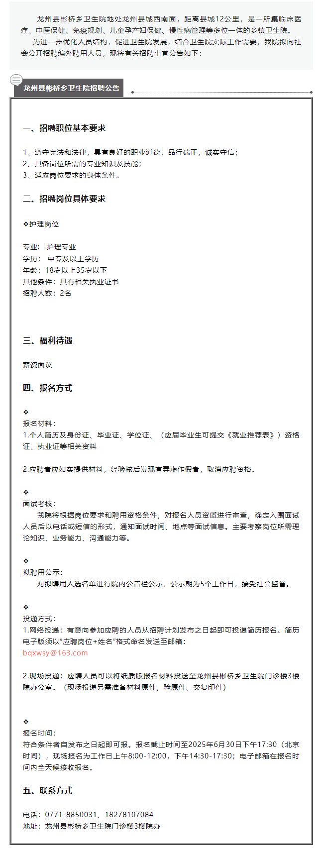 原文標題:龍州縣彬橋鄉(xiāng)衛(wèi)生院招聘公告