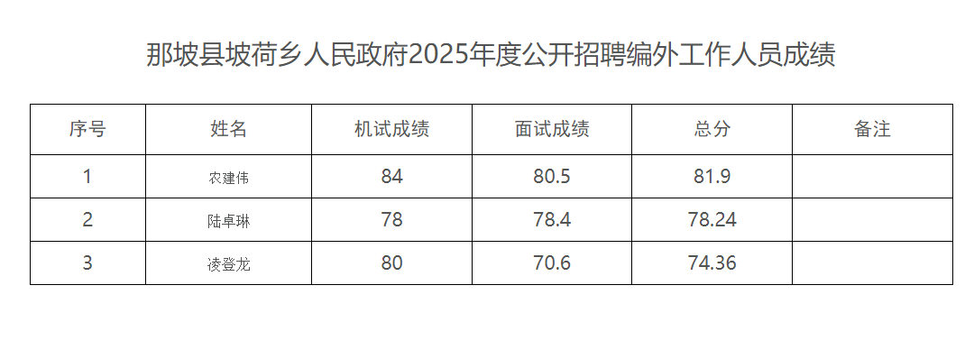 那坡縣坡荷鄉(xiāng)人民政府2025年度公開招聘編外工作人員成績(jī)公示