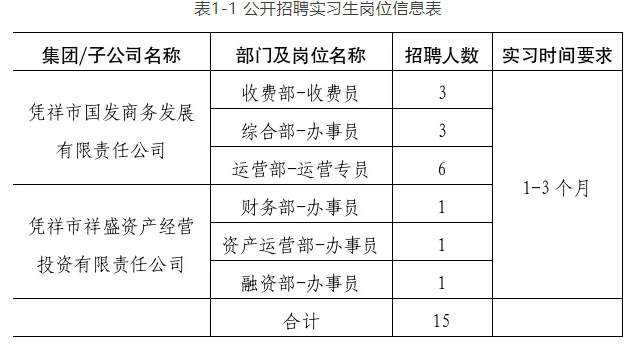 本次共計劃招聘憑祥市國際貿(mào)易開發(fā)集團有限公司下屬企業(yè)實習生崗位15人。具體要求詳見《附件1:憑祥市國際貿(mào)易開發(fā)集團有限公司2025年公開招聘暑期實習生崗位信息表》