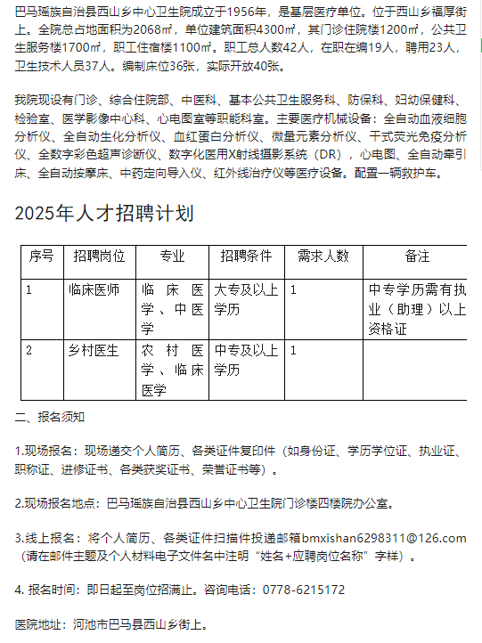 原文標(biāo)題:巴馬瑤族自治縣西山鄉(xiāng)中心衛(wèi)生院2025年人才招聘