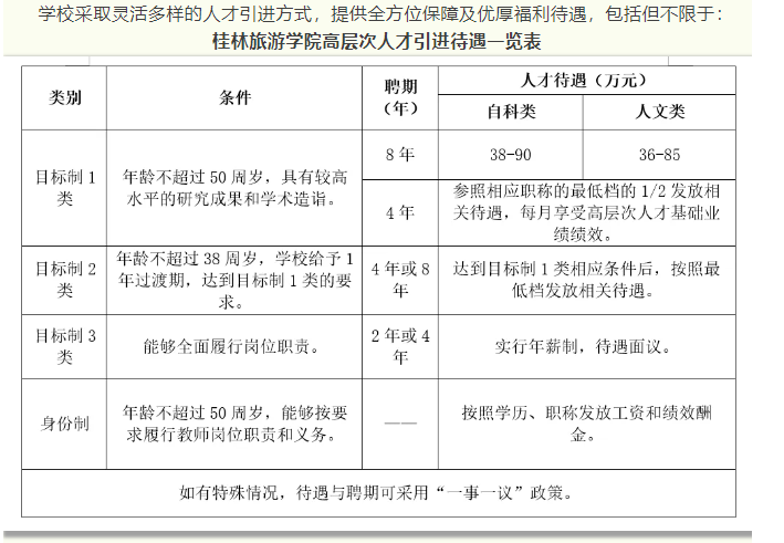 4.根據(jù)自治區(qū)政府文件要求,符合相應(yīng)條件者,學(xué)校積極配合申請(qǐng)廣西壯族自治區(qū)高層次人才認(rèn)定和各類(lèi)人才項(xiàng)目,若入選可享受各類(lèi)優(yōu)厚的人才待遇,詳情請(qǐng)登錄廣西高層次人才“一站式”服務(wù)平臺(tái)(http://www.gxrc.org/)查閱。首次來(lái)桂工作的35歲以下、具有博士學(xué)位的青年人才,可按照政策申領(lǐng)自治區(qū)青苗人才普惠性支持。如入選桂林市高層次人才,還可以享受桂林市高層次人才有關(guān)津貼、購(gòu)房補(bǔ)貼和個(gè)稅獎(jiǎng)勵(lì)等人才補(bǔ)助。詳見(jiàn)桂林市高層次人才一站式服務(wù)平臺(tái)(https://gcc.glrcw.com/)。