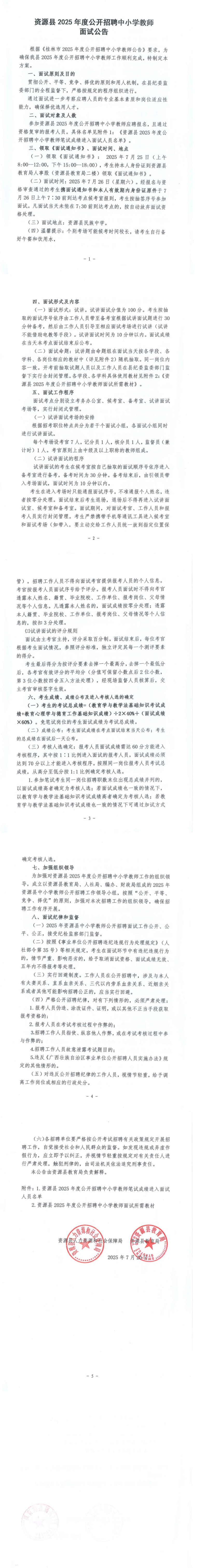 資源縣2025年度公開招聘中小學(xué)教師面試公告