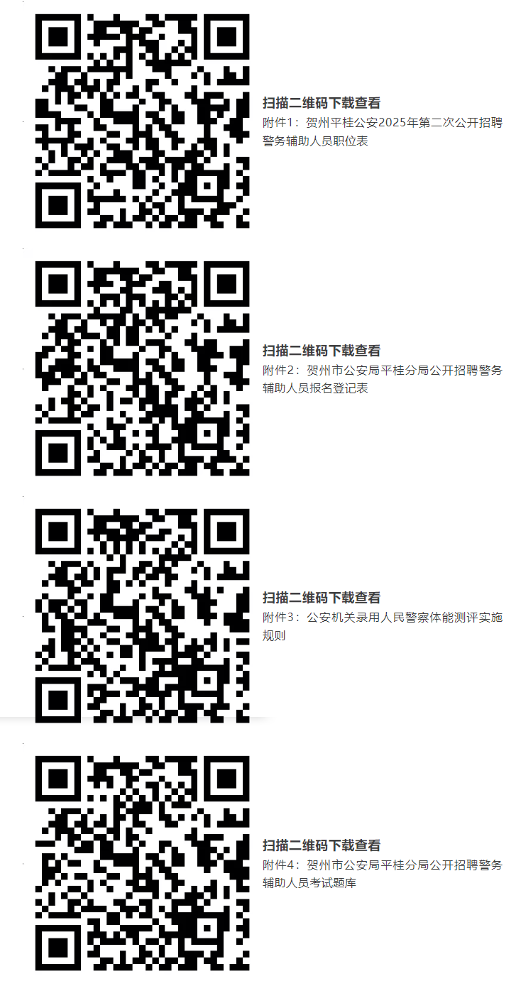 報考人員自2025年7月21日起,可通過賀州市公共就業(yè)和人才服務中心“賀州市微就業(yè)”官方微信(gxhzjy)、賀州市公安局平桂分局“平桂警方”官方微信(pggafj)查閱招聘簡章及《職位計劃表》(附件1)等相關(guān)招聘信息。