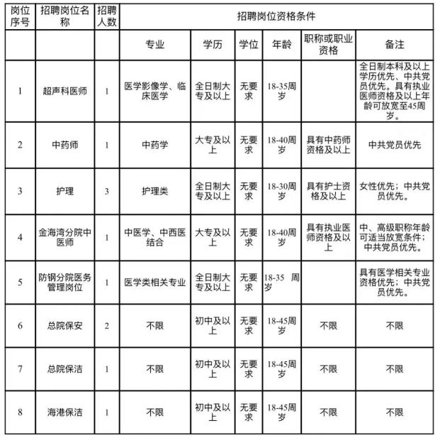 為了解決醫(yī)院人員緊缺狀態(tài),完善科室設置,進一步提升醫(yī)療服務水平,確保醫(yī)療安全,更好地滿足企沙工業(yè)園區(qū)各大企業(yè)及廣大人民群眾醫(yī)療服務需求,特面向社會招聘11名工作人員,具體如下: