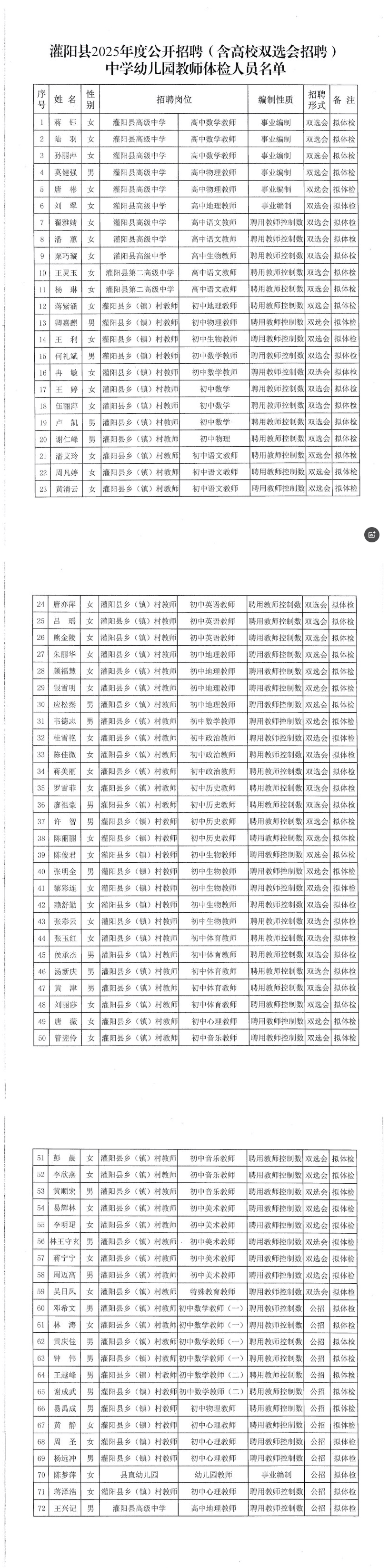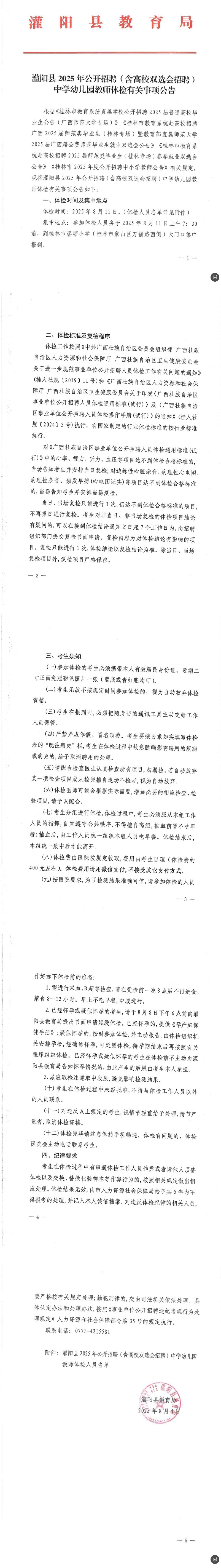 灌陽縣2025年公開招聘(含高校雙選會招聘)中學(xué)幼兒園教師體檢有關(guān)事項公告