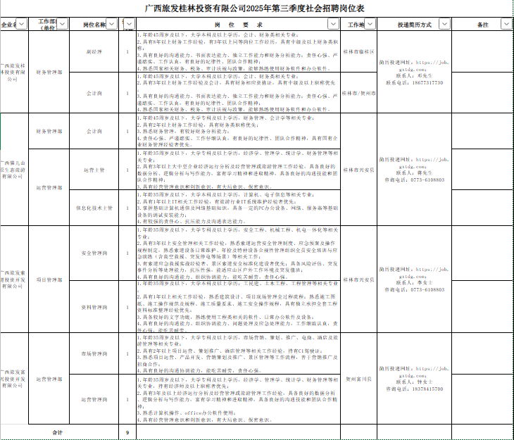 廣旅桂林投資公司有關(guān)崗位員工9名(詳見(jiàn)附件)。