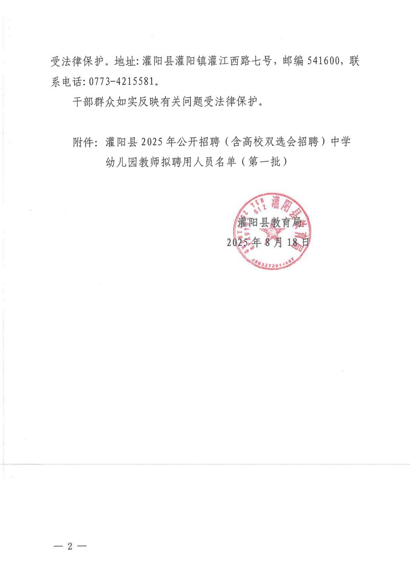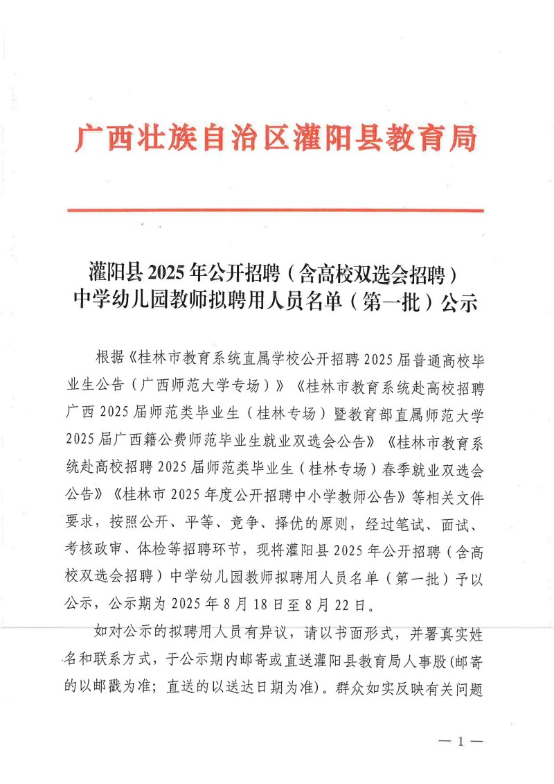 灌陽縣2025年公開招聘(含高校雙選會(huì)招聘)中學(xué)幼兒園教師擬聘用人員名單(第一批)公示
