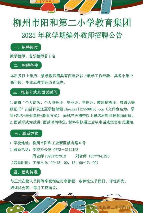 2025年秋學期柳州市陽和第二小學教育集團編外教師招聘若干人