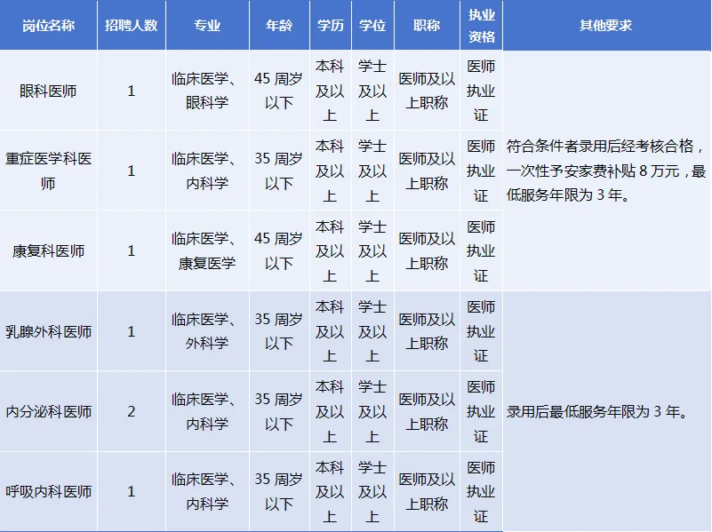 ■ 眼科、康復(fù)醫(yī)學(xué)科、重癥醫(yī)學(xué)科醫(yī)師為我院緊缺崗位人才,符合條件錄用者,經(jīng)試用考核合格后可享受安家費補(bǔ)貼。