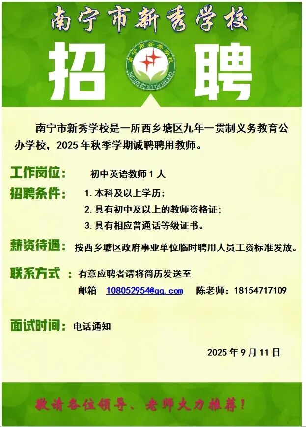原文標題:2025年南寧新秀學(xué)校招教師1人
