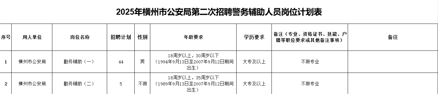 附件1.橫州市公安局2025年度第二次公開招聘警務輔助人員崗位計劃表