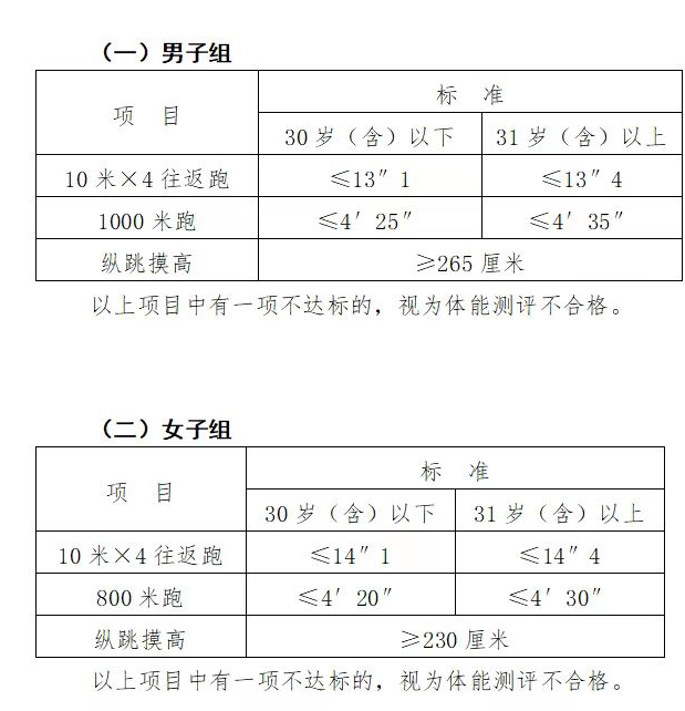 體測項目為縱跳摸高、10米×4往返跑和1000米(男)或800米(女)長跑,體能測試項目評分標準依據(jù)《公安機關(guān)錄用人民警察體能測評項目和標準(暫行)》執(zhí)行(見附件3),體能測試項目規(guī)則按照《公安機關(guān)錄用人民警察體能測評實施規(guī)則》執(zhí)行(見附件4)。