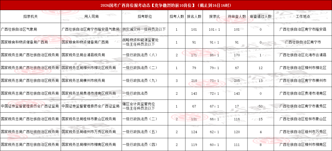 我們接著來看廣西地區(qū)國考報名競爭最激烈的前十職位匯總情況。當(dāng)前,國家稅務(wù)總局廣西壯族自治區(qū)稅務(wù)局-國家稅務(wù)總局桂林市臨桂區(qū)稅務(wù)局的【一級行政執(zhí)法員(三)】 職位,以220人的報名數(shù)成為目前前十職位中最熱門的選擇。