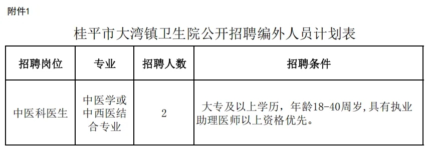 附件:1.桂平市大灣鎮(zhèn)衛(wèi)生院公開招聘編外工作人員計劃表