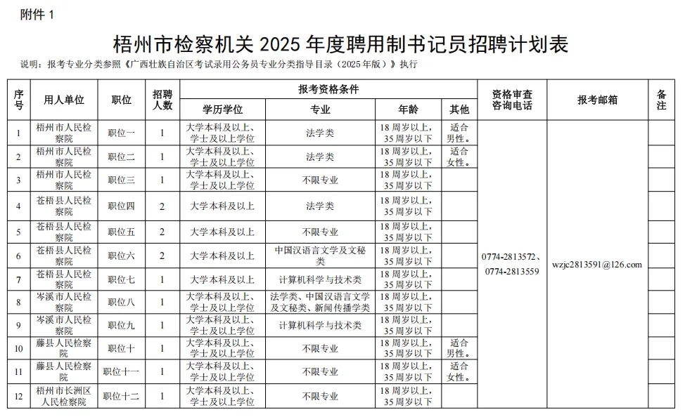 各職位具體報(bào)考條件詳見《梧州市檢察機(jī)關(guān)2025年度聘用制書記員招聘計(jì)劃表》。