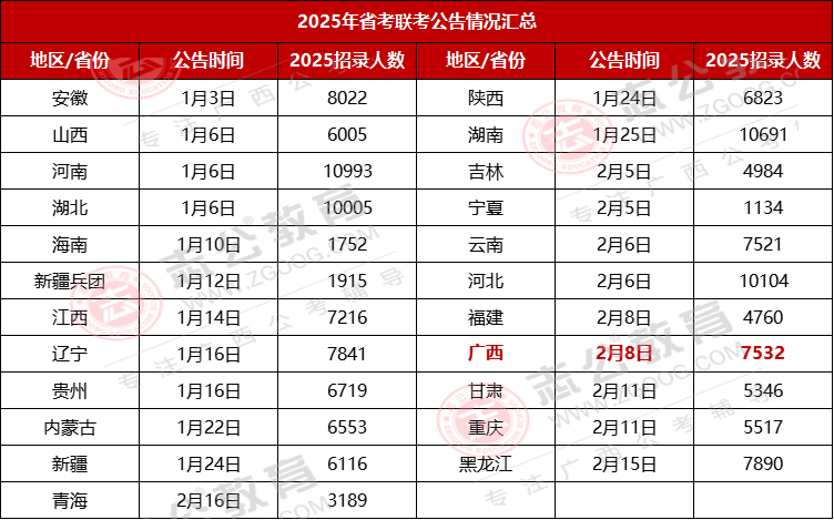 由廣西壯族自治區(qū)公務員局發(fā)布,核心查詢平臺為八桂先鋒網(wǎng)、廣西人事考試網(wǎng),也可在各市黨建網(wǎng)、人事考試相關(guān)平臺查看。2025年公告發(fā)布時間為2月8日。