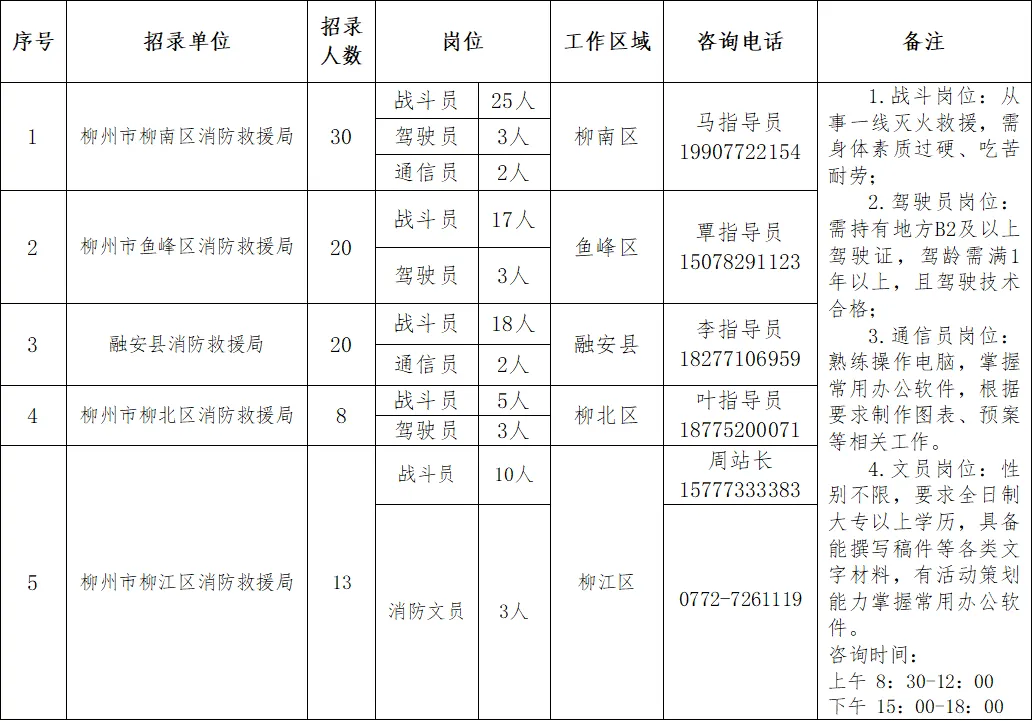 為進一步加強柳州市消防救援隊伍力量建設,提升綜合應急救援能力,柳州市消防救援局按照“公平公正、平等自愿、競爭擇優(yōu)”的原則,面向社會公開招錄政府專職消防員,現(xiàn)將有關事項公告如下: