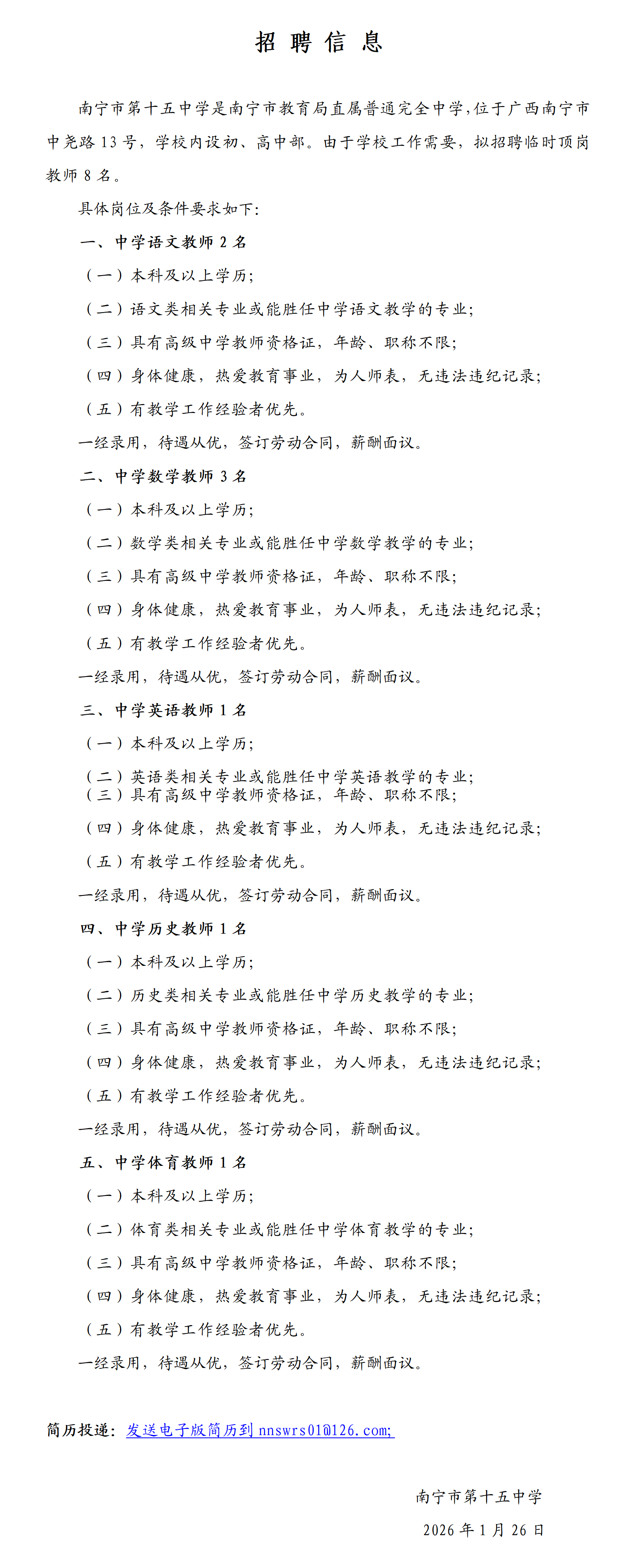 2026年南寧市第十五中學(xué)招聘