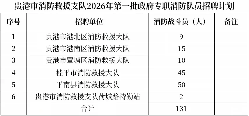 為滿足貴港市社會經(jīng)濟發(fā)展對消防力量的需求,有效提升社會災(zāi)害防控能力,貴港市消防救援支隊按照德才兼?zhèn)浜?ldquo;公開公正、平等自愿、競爭擇優(yōu)”的原則,面向社會公開招錄131名政府專職消防員?,F(xiàn)將有關(guān)事項公告如下: