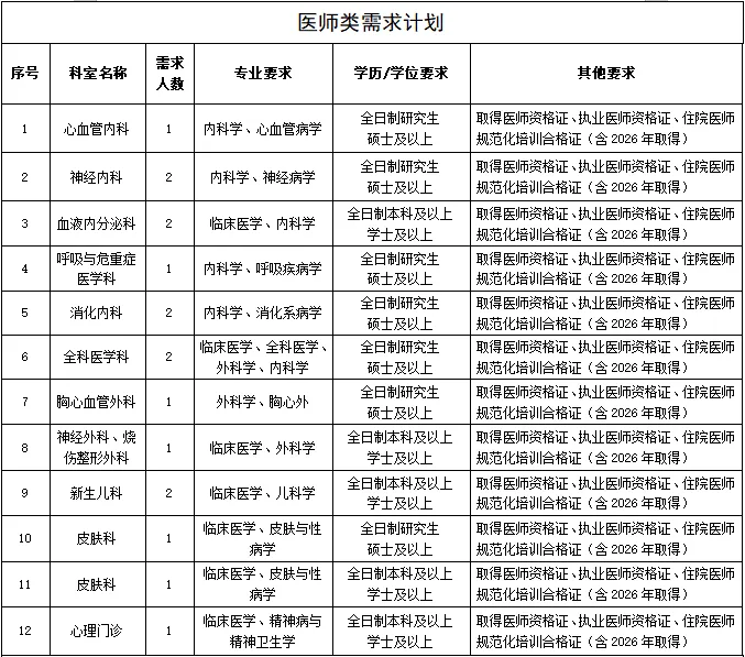 為進一步完善現(xiàn)有人才隊伍,促進醫(yī)院學(xué)科發(fā)展,提升醫(yī)院綜合實力,因業(yè)務(wù)發(fā)展需要,現(xiàn)面向社會進行公開招聘,具體招聘崗位如下: